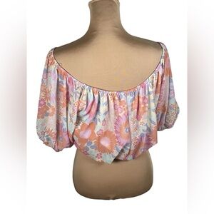 This charming blouse features a relaxed, smocked design with a coral pink and light blue floral pattern. The off-shoulder neckline and short puff sleeves add a playful touch, while the cropped hemline offers a modern silhouette. Crafted from lightweight fabric, it ensures comfort and style for any casual outing.