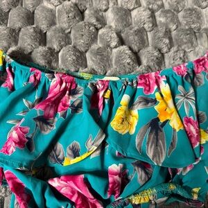 Give summer vibes with this floral off-shoulder top. Featuring a vibrant teal base with pink and yellow flowers, it's perfect for any occasion. Paired with a skirt, shorts or jeans. This item is new without tag. 100%Polyester, Size Medium and Small available.