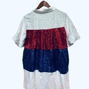 Stand out from the crowd with this bold and sparkly Peach Love sequin dress in vibrant red, white, and blue. Featuring a collared neckline, button-down front, and a fun, relaxed fit, this versatile piece can be styled as a mini dress or worn open as a tunic top.