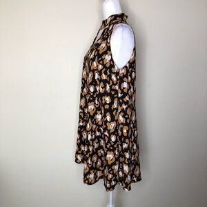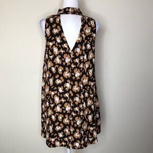 Peach Love California Leopard Print Cut Out High Neck Mini Dress. It features a high neckline with a cutout detail, and a mini length. The dress is sleeveless and made of a lightweight fabric. Tan/ Black/ White Size: Medium