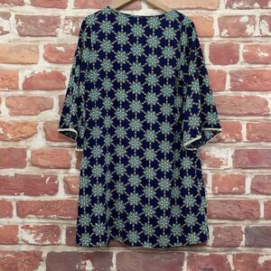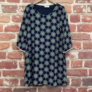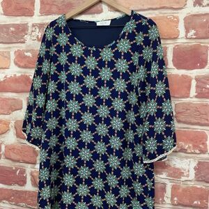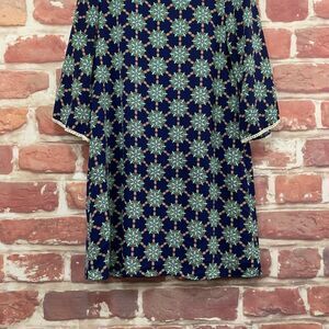 ▪️ Women's Bohemian sttyle dress: Scoop neckline, pullover, abstract pattern, embroidered trim, lining, and ¾ sleeves. Pre-owned. Wear it with your favorite flats or heels!