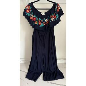 Peach Love Floral Embroidered Jumpsuit Size Medium Navy