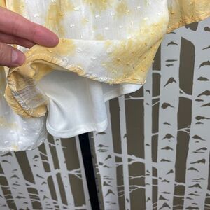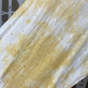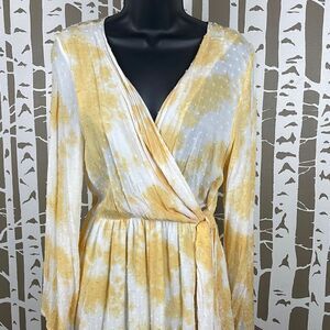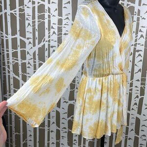 Additional Details: Swiss Dot texture, sheer through the top, lined through the shorts, elasticized waistband, wrap over/side tie front, long loose sleeves.