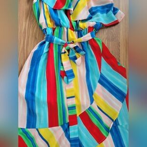 In a world full of color, why choose just one? Especially when you can have a beautiful, colorful & fun dress like this! Dress features a one shoulder style, elastic waistline and ruffles around the edges. Dress is fully lined.