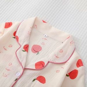 Peach Print Pajama Set, Cute Lapel Buttons Top & Bow Shorts, Women's Sleepwear & Loungewear