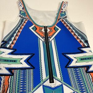 Sleeveless bodycon mini dress with eye-catching blue, green, orange, and white geometric Aztec print