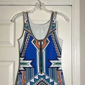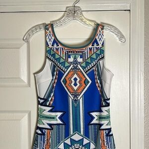 Sleeveless bodycon mini dress with eye-catching blue, green, orange, and white geometric Aztec print