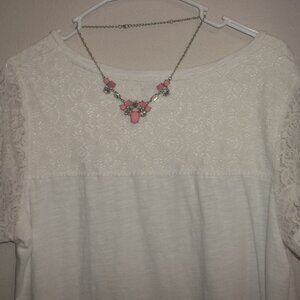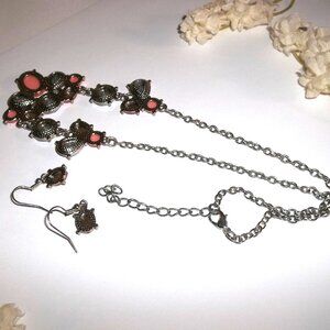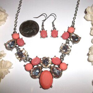 This pre-owned jewelry set is costume jewelry. They are silver toned. The earrings are just a simple minimalist style oval peach acrylic cabochon. The pair dangle and drop from French fishhook ear wires for her pierced ears. Measure 1 1/4 inch tall and 3/8 inch wide. Each single earring weighs 0.8 grams. Very lightweight. The statement style bib necklace is very eye-catching with faux white aurora borealis rhinestone diamonds mixed in with the peach stones. The short chain necklace can be worn up to 20 inches using the built-in extender. Could be worn shorter by attaching the lobster claw clasp lower on the chain. Bib/rhinestone part is 4 3/4 inches long and 1 3/8 inch tall. Very versatile piece. Could be worn fancy dressing up or dress down business comfort casual style. Very unique and eye-catching Buy it now before someone else does!