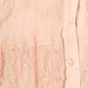 Peach Ruffle Dress , Long sleeve with all over lace ruffled front details. lined, back is sheer with lining.
