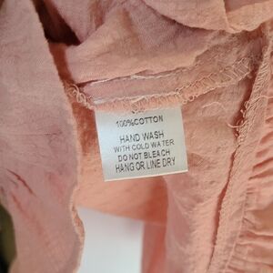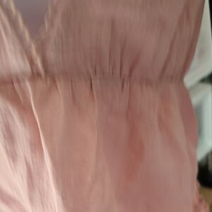 Soft peach camisole with adjustable spaghetti straps and a feminine ruffle hem. Lightweight, breathable fabric designed for easy layering or wearing solo. Delicate trim at the V-neck adds subtle detail for a polished look.