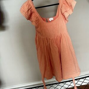Charming peach dress with ruffled sleeves, perfect for any occasion.