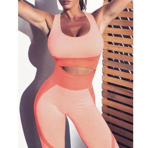 Two piece yoga workout set. Top has thumb holes, straps crisscross on back. color: peach, never worn