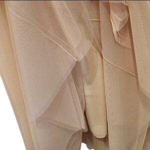 Tulle overlay with a shorter lining. Super flowy with an elastic waistband for a perfect fit. Color is peach.