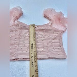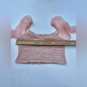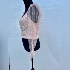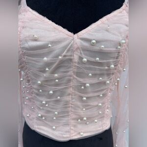 Elegant Women's XL Pearl-Embellished Long Sleeve Blush Pink Ruched Mesh Crop Top in excellent condition fairy, Princess, feminine and sexy