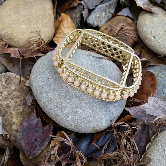 This gold Birdcage Bangle bracelet is stunning and unique. The peach stones go all the way around.