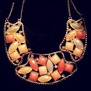 Peach tones stones in a gold trimmed necklace with matching earrings