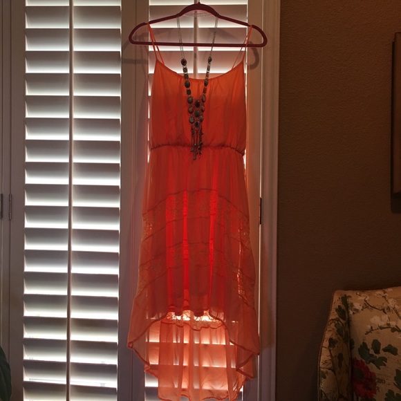 Very cute! Great coral or peach color. Adjustable spaghetti straps, lace trim, elastic waist, built in liner. Never been worn. Perfect for spring and summer.