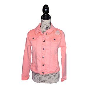 A beautiful refashioned, up-cycled peach colored denim jacket. The back is a chiffon-like material which is slightly transparent. Although there is a floral trim, the denim is designed to fray a little upon wearing. Above the faux chest pockets is a crochet overlay and a broach which has been sewn on. The size is Justice 14/16, girls. The jacket measures 17 inches from pit to pit, and 20 inches from collar to hem.