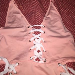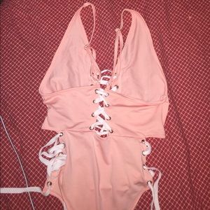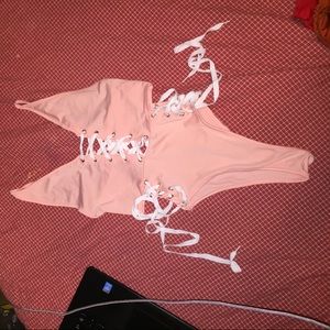 Super cute monokini. Never worn. Size small with lace up detail on the front, side, and back. The fabric is a little thin and the straps were sewn weird hence the low price.