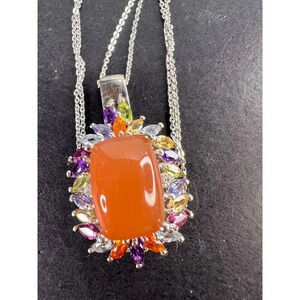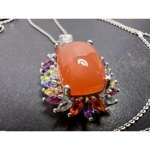 Natural peach moonstone cabochon in the middle , surrounded by multiple marquis gemstones that include amethyst, fire opal , blue topaz, peridot, citrine, tanzanite, rhodolite garnet, and zircon. Prong set in a platinum plating over sterling silver setting. Chain measures 20 inches. Lobster claw clasp . 9.63 ctw 925