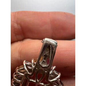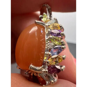 Natural peach moonstone cabochon in the middle , surrounded by multiple marquis gemstones that include amethyst, fire opal , blue topaz, peridot, citrine, tanzanite, rhodolite garnet, and zircon. Prong set in a platinum plating over sterling silver setting. Chain measures 20 inches. Lobster claw clasp . 9.63 ctw 925