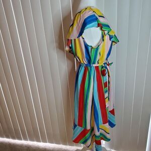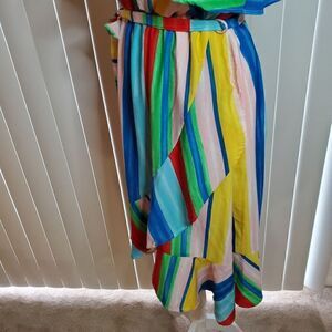 Peach Love California. Bright multicolor stripes. One shoulder. Ruffled layers. Elastic waist. Adjustable sash. Knee length