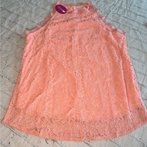 Introducing a brand new, with tags (NWT), peach lace halter sleeveless top in a trendy seasonal color. This charming top boasts a stylish keyhole and button close back, adorned with delicate eyelash fringe accents around the arms and neck. It comes fully lined and pairs perfectly with shorts, capris, or skirts for a versatile and chic look.