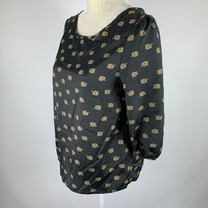 Black with gold elephant pattern light ( polyester ) blouse. 3/4th sleeves with cute back. No holes or stains and smoke free home.