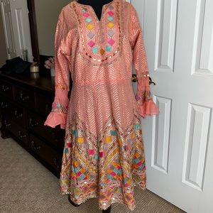 Peach/pink Punjabi sharara/ghar are suit with gold detailing and contrast teal dupatta. Worn once, in great condition. Approx US size 8-10