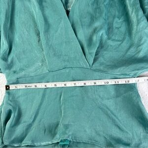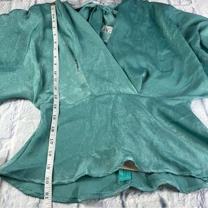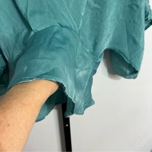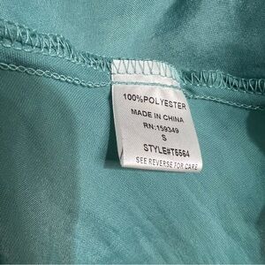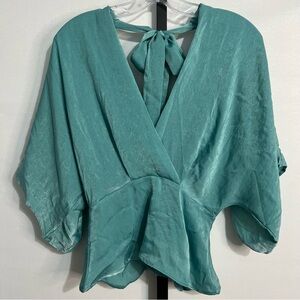 Beautiful silky soft blouse with billowing sleeves. This is a polyester but looks and feels like a satin silk. It is called sage on the tag but looks like a a lighter teal color. This is new with tags and comes from a smoke free home. This has a beautiful tie in the back as well