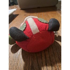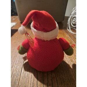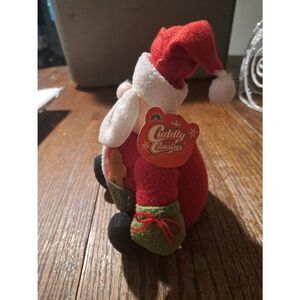 Peachtree Playthings Cuddly Cousins plush Santa Claus, approximately 7.5–8 inches tall. Made with polyester fibers and a sand bottom to sit securely, this round Santa is perfect as a shelf or table sitter. Features a red and white hat, white beard, red and white jacket, green and black shoes, and original tag attached. Roly-poly, cute holiday plush ideal for farmhouse Christmas décor, mantel, or tabletop display. Good used condition.