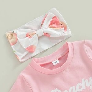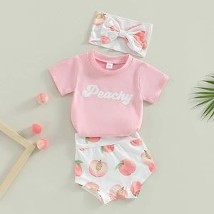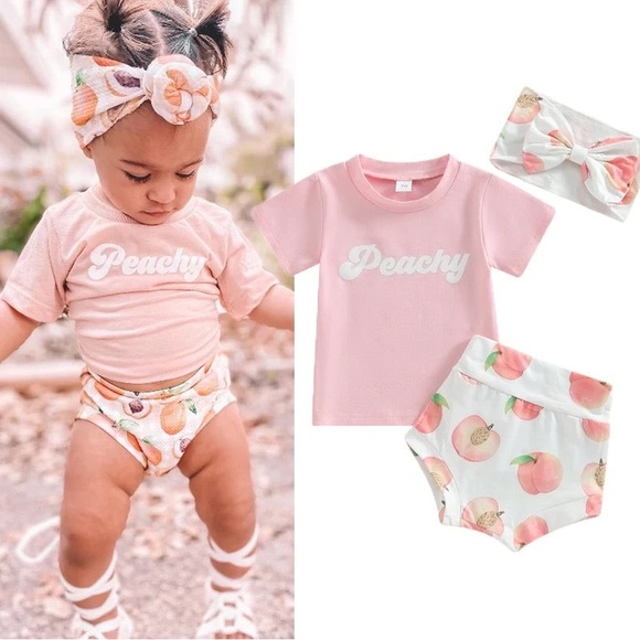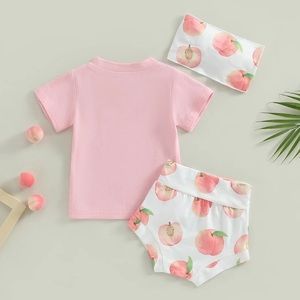 3pcs Lovely Baby Girls Clothes Sets 0-24M Short Sleeve Letters T-shirt Peach Print Shorts Bowknot Hairband