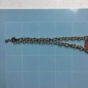 Choker length statement necklace with two rows of opaque and translucent, peachy-pink, acrylic plastic beads. Light wear throughout; gold tone plating is worn on the chain and extender, with some silver-toned metal showing through. Modern, or contemporary, costume jewelry. Measures about 19 inches long.