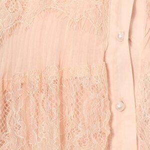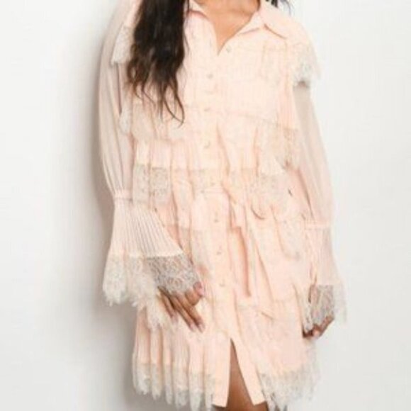 Peach Ruffle Dress , Long sleeve with all over lace ruffled front details. lined, back is sheer with lining.