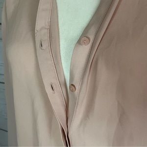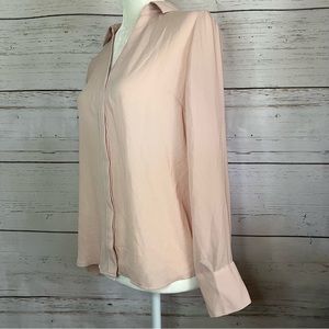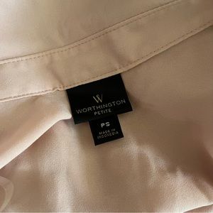 Peachy pink button up shirt by Worthington, hidden button placket, buttoned long sleeves, back pleats at yoke, semi sheer, excellent used condition, approximate measurements: 24” long; 19” across armpits; 23” sleeves