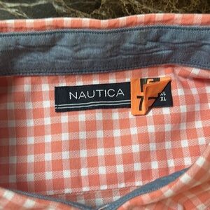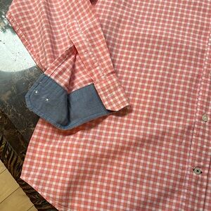Peach colored checkered button down with blue at cuffs. Worn a couple times and professionally dry cleaned. Size XL. Good used condition.. see pictures.