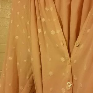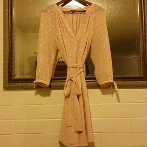 Gorgeous, flowy dress with sheer sleeve that ties at elbow, tie waist belt, and small sewn flowers. Flattering on every body type!