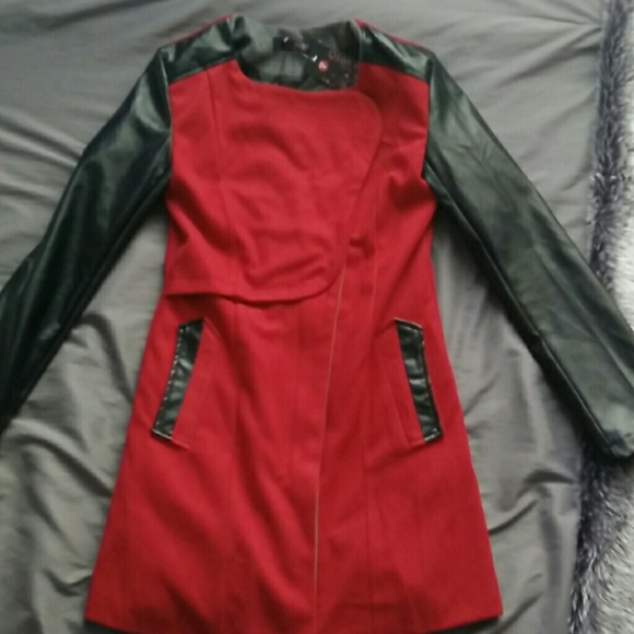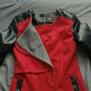 Its a red peacoat with leather sleeves and grey collar. It is size Small. Never been worn and is with a tag