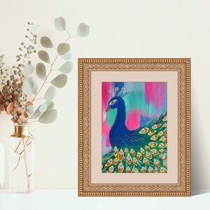 This piece, Patience the Peacock, was created during the pandemic while I waited: for fear to dissipate, for life to feel normal again. It was deeply symbolic of patience, with each stroke being a reminder that things take time - each eye on the feathers is the result of 6 layers of paint, all done when dry. Peacocks symbolize renewal; they shed feathers and begin again more beautifully. This is a print of my most meaningful work, a reminder that growth comes through stillness and patience.