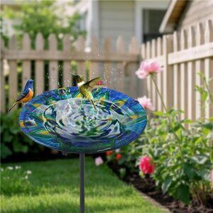 Peacock Bird Bath Bowl: Glass bird bath with stake is 10.5"D * 26.2"H; The birdbath is painted with bright and vivid peacock patterns, which can attract more bird friends to bathe or play in the bird bath, adding color and vitality to your garden