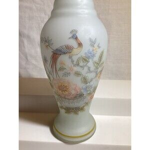 Add a touch of elegance to your home decor with this stunning white frosted art glass bud vase from UCGC. The vase features a beautiful peacock pattern with colorful flowers, making it a perfect addition to any room. With a size of 10 inches, it is suitable for medium-sized flowers and can be used for all occasions.