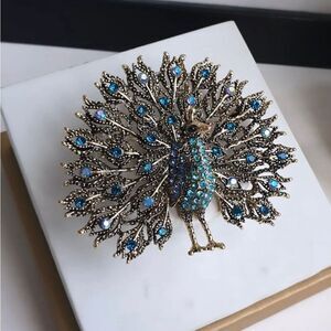This stunning pin features shimmering rhinestones in a vibrant peacock blue color, perfect for adding a pop of color to any outfit.
