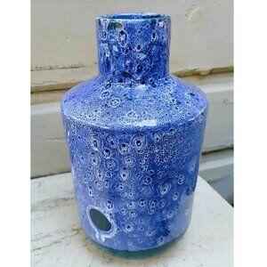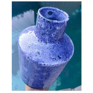 This is a stunning Peacock Blue Fat Lava Moon Glazed Ceramic Vase by Portuguese ceranmic master Faiancas Ramos. The vase has a unique and striking glossy glaze in variious shades of blues and greens that explode over the surface like lava and resemble peacock feathers patterns. The bottom has a dark emerald green solid color with that same emerald green popping up occasionally throughout the vase.