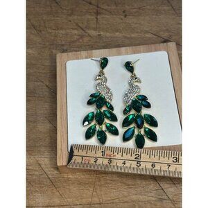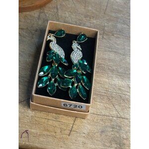 These peacock-inspired earrings are adorned with sparkling crystals and vibrant green gemstones, creating an eye-catching effect. They are an exquisite accessory for a night out or a special occasion, adding a touch of elegance and color to any ensemble.