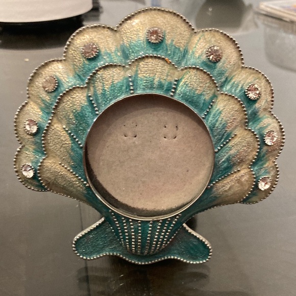Elegant peacock design photo frame with rhinestone accents. Features teal and cream colors.