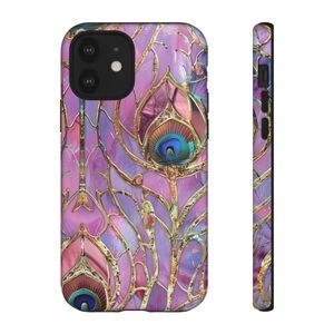 Enhance your phone with this stylish iridescent pink purple blue green peacock feathers trendy stained glass design IPhone 16, 15, 14, 13, 12, 11, 8, X, XR, XS, XS Max (Pro Max, Pro, Plus, Mini) case. Perfect for adding a touch of elegance to your device.