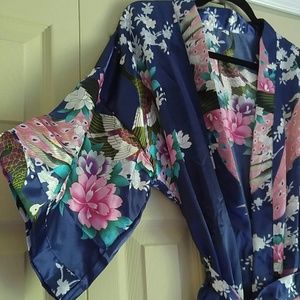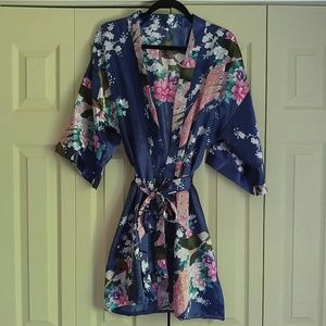 Silky kimono robe with floral and peacock print. One size fits most- no tag. Worn once for a few hours for a wedding bridal party. No flaws. Fits size XS- large.