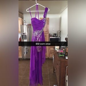 Beautiful purple high low dress with peacock feather accents. Worn once.