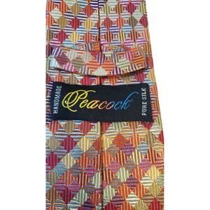 This Peacock designer neck tie is a luxurious and stylish accessory for men. Made of 100% silk with a multicolor geometric pattern, this classic-sized tie is perfect for business, church, or formal occasions. It is adjustable, handmade, and exudes a sense of power and sophistication, making it ideal for business attire or adding a touch of luxury to any outfit.