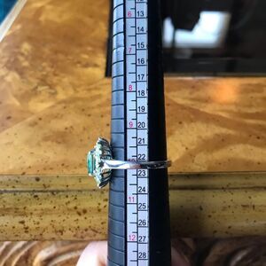 This statement ring is made with peacock triplet quartz as the center stone. This stone is such a beautiful blue/green. It looks like wearing part of the ocean. The ring additionally has natural, earth mined peridot, blue apatite, and white zircons. The ring is set in solid .925 sterling silver with a rhodium plate to prevent tarnishing. The ring in the photos is the one you will receive, so please see photos for quality and measurements. Size 10.